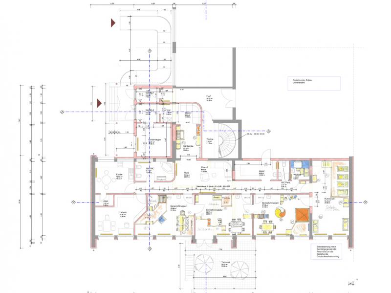 Hierzu wurde in rekordverdächtiger Bauzeit von nur 6 Monaten der ganze Komplex entkernt, die gesamte Technik erneuert, ein energetisch sinnvolles Gesamtkonzept umgesetzt und ein kuscheliges "Spatzennest" konzipiert und eingerichtet. Hierzu bedurfte es eines äußerst rationellen Bauablaufes, der nur durch eine optimale Koordinierung der Leistungen von ca. 25 beteiligten Baufirmen gelingen konnte. Sämtliche Architektenleistungen, vom Entwurf über die Bauüberwachung bis zur Abrechnung wurden von unserem Büro erbracht.